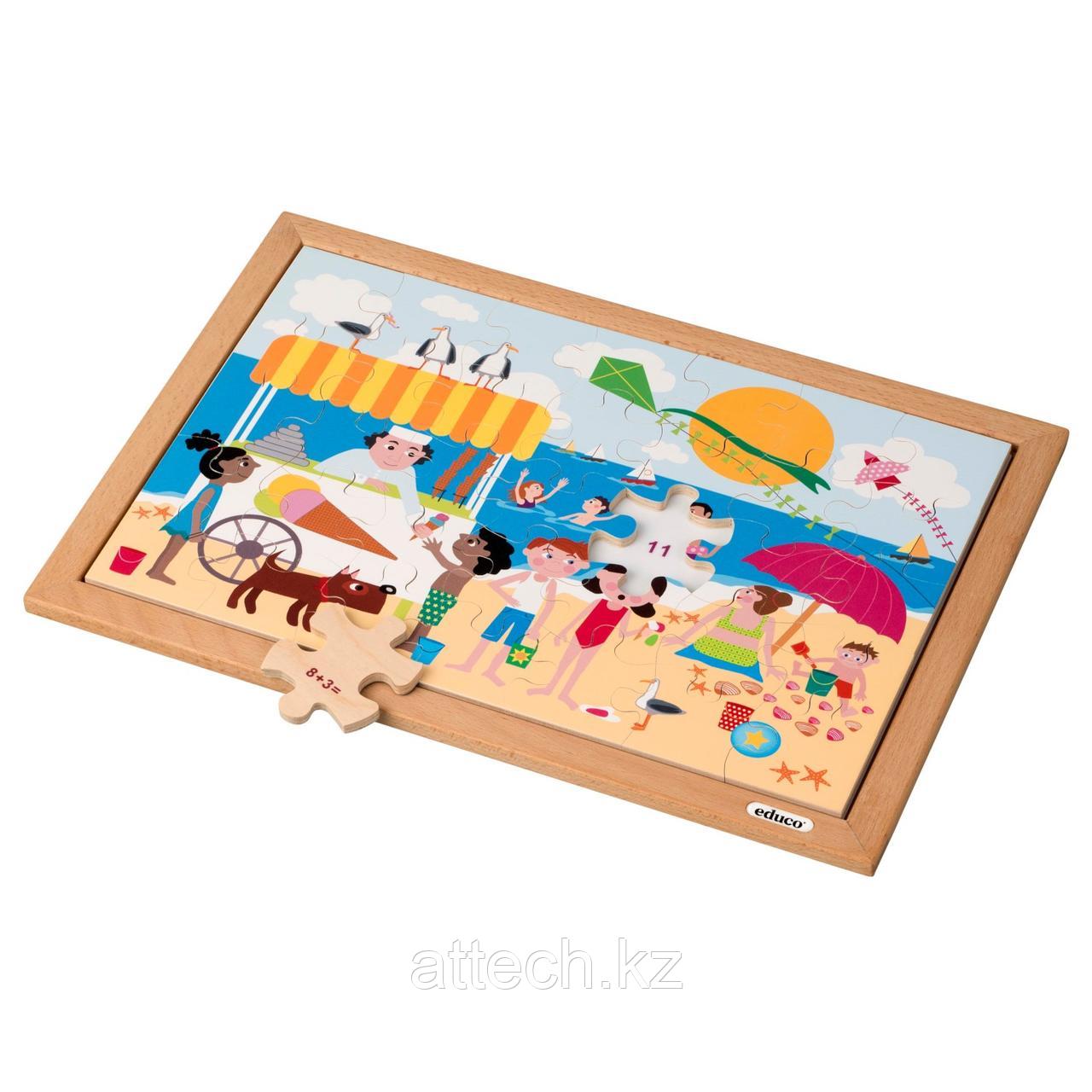 | Тренируйтесь в понимании чисел от 0 до 12. Поупражняйтесь с уравнениями на сложение и вычитание, в результате которых получается максимальное число 12. Этот деревянный арифметический пазл содержит 35 деталей. На каждом кусочке головоломки изображён результат вычитания или сложения. Результат каждого действия соответствует числу на рамке. Также обратите внимание на цвет, так как некоторые числа встречаются несколько раз. На самой картинке тоже есть на что посмотреть и что посчитать. Все дело в пляже. Кого вы видите на пляже? А вы когда-нибудь ходили на пляж? Сколько морских звезд и сколько ракушек вы видите? Какое мороженое вы любите? Какого цвета зонтик? Помимо того, что собирать пазл весело, он способствует пониманию цифр от 0 до 12, тренирует сложение и вычитание чисел от 0 до 12, а также расширяет словарный запас. Состав: деревянная рамка (40 x 28 см) 35 деревянных деталей головоломки с уравнениями на сложение и вычитание до 12 |